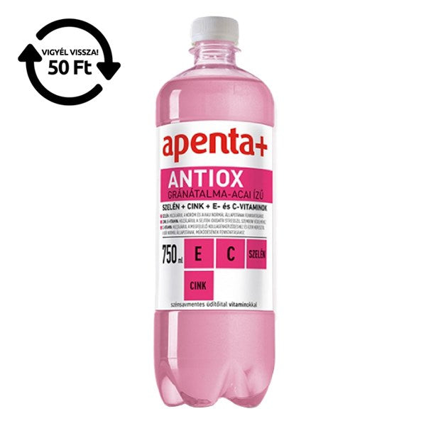 Apenta+ Antiox acai-gránátalma ízű szénsavmentes, energiamentes üdítőital édesítőszerekkel, természetes ásványvízzel, C- és E-vitaminokkal, szelénnel és cinkkel.