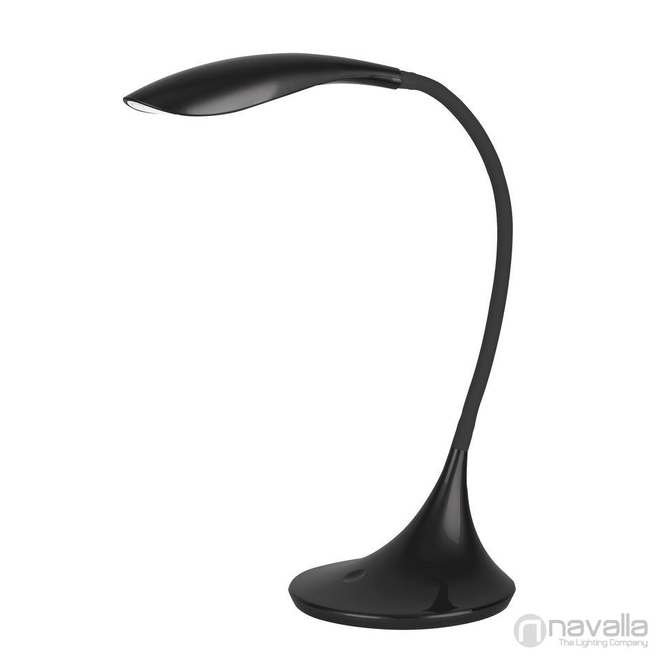 Modern megjelenésű asztali lámpa beépített energiatakarékos LED fényforrással és 3 fokozatban állítható, érintőkapcsolós fényerősségszabályozóval. 52 cm magas, 32 cm széles, fekete színű műanyag lámpatest és műanyag lámpabúra. A beépített LED fényforrás és 5,3W teljesítmény mellett 520 lumenes fényerőt és 3000 Kelvines, azaz melegfehér színű fényt kínál. 5 év garanciával. A lámpatestben elhelyezett fényforrás nem cserélhető.