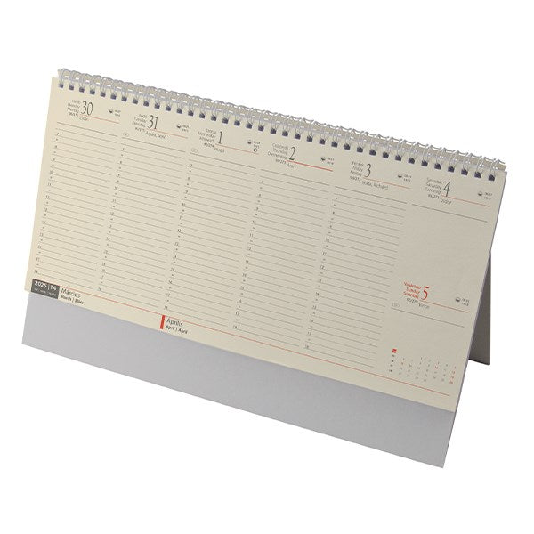 Ikerspirállal összefűzött álló naptár, heti beosztással (félórás). Reklám felület: 320x40mm Egyediesítés: szita