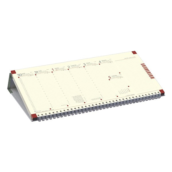Műbőr táblával készült, chamois (krémszínű) tömbös, fekvő asztali naptár, perforált jegyzettömbbel.Vaknyomással emblémázható. Naptárbeosztás: 6-22 óráig, 8-18 óráig félórás beosztással.