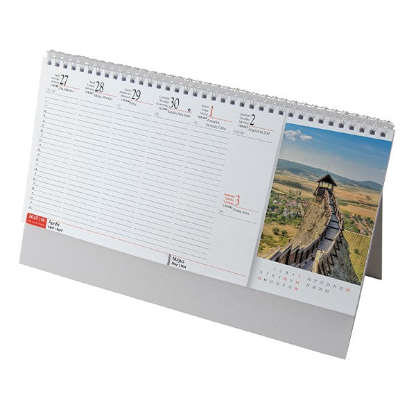 Ikerspirállal összetűzött naptár heti beosztással, 12 színes képpel, papírtáblás, álló asztali naptár. Naptárbeosztás: heti. Reklámfelület: 320x40 mm