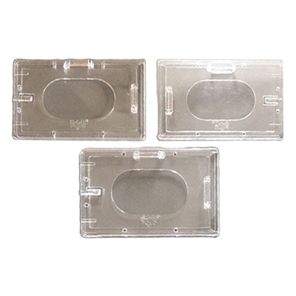 Áttetsző, merev kártyatok, elől hátul zárt, 85x54mm belső méret. Fekvő és álló elrendezéssel is viselhető.