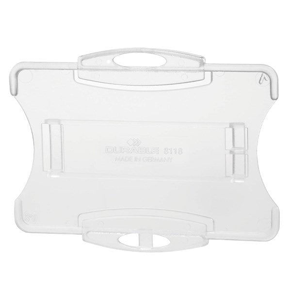 Nyitott kivitelű biztonsági kártyatartó 1 db kártyához. Klippel, kihúzható tartóval, lánccal vagy textilszalaggal kombinálható. A kártyatartó tetszés szerint álló vagy fekvő formátumban is használható.
