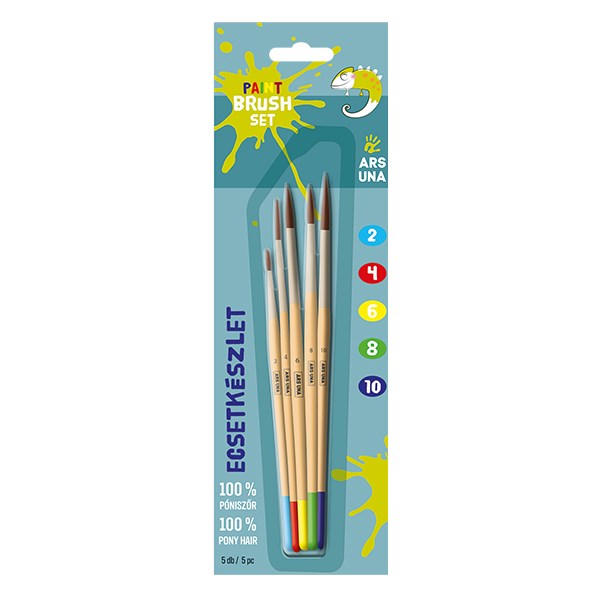 5 db-os ecsetkészlet (2-4-6-8-10 méret). Kerek, natúr fa ecsetek, a végén festéssel és valódi póniszőrből készült hegyes ecsetfejjel. Méret: 9,4 cm x 29,8 cm x 0,05 cm. Súly: 34g. Rendelési minimum: 10 db