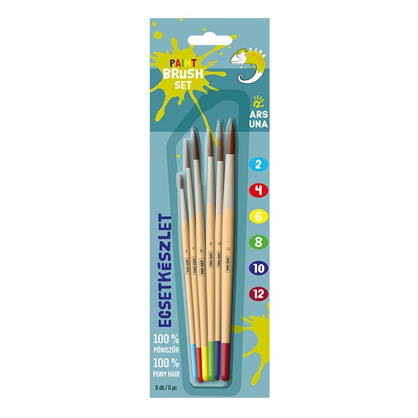 6 db-os ecsetkészlet (2-4-6-8-10-12 méret).Kerek, natúr fa ecsetek, a végén festéssel és valódi póniszőrből készült hegyes ecsetfejjel. Méret: 9,4 cm x 29,8 cm x 0,05 cm. Súly: 40g. Rendelési minimum: 10 db