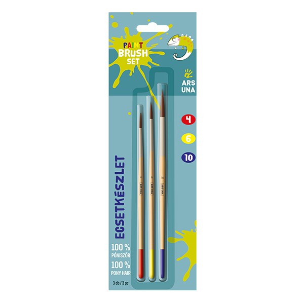 3 db-os ecsetkészlet (4-6-10 méret). Kerek, natúr fa ecsetek, a végén festéssel és valódi póniszőrből készült hegyes ecsetfejjel. Méret: 9,4 cm x 29,8 cm x 0,05 cm. Súly: 26g. Rendelési minimum: 10 db