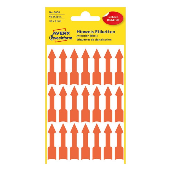 Etikett AVERY 3008 nyíl alakú fluoreszkáló piros 39x9mm 63 címke/csomag