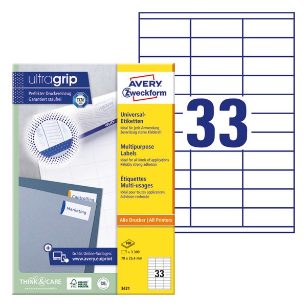 Etikett AVERY 3421 70x25,4mm univerzális fehér 3300 címke/doboz 100 ív/doboz