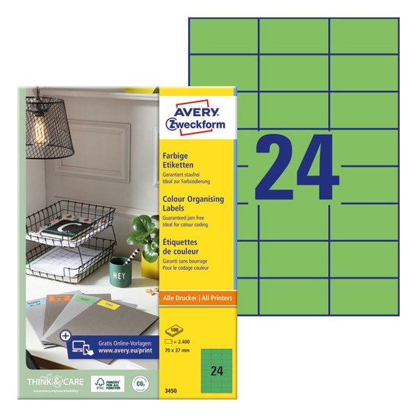 Etikett AVERY 3450 70x37mm univerzális zöld 2400 címke/doboz 100 ív/doboz