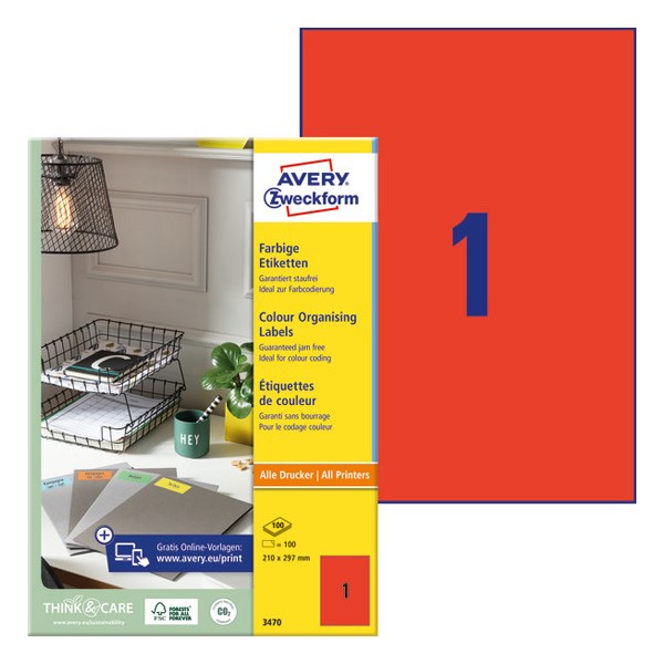 Etikett AVERY 3470 210x297 mm piros univerzális 100 címke/doboz 100 ív/doboz