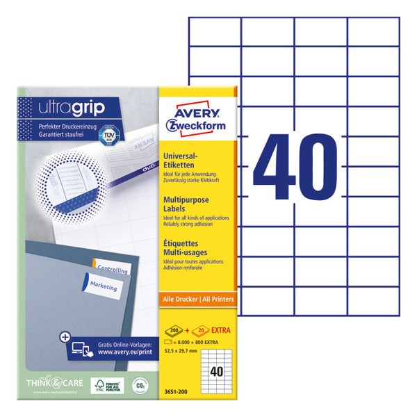 Etikett AVERY 3651-200 52,5x29,7 mm fehér univerzális 8800 címke/doboz 200+20 ív/doboz