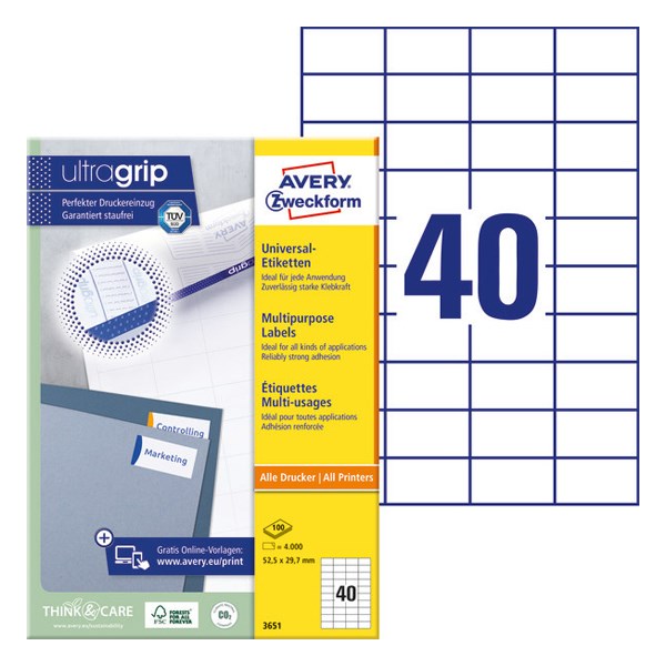 Etikett AVERY 3651 52,5x29,7mm univerzális fehér 4000 címke/doboz 100 ív/doboz