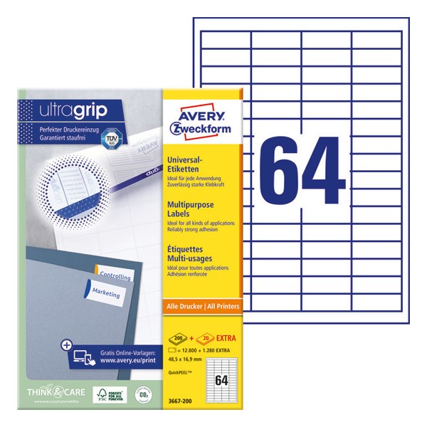 Etikett AVERY 3667-200 48,5x16,9 mm fehér univerzális 14080 címke/doboz 200+20 ív/doboz