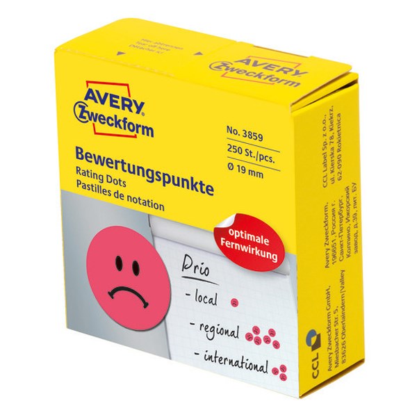 Etikett AVERY 3859 öntapadó jelölőpont adagoló dobozban szomorú arc mintás piros 19mm 250 jelölőpont/doboz