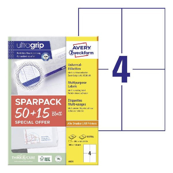 Minőség a címkeszakértőtől: az Avery Zweckform 6601-es cikkszámú, gazdaságos csomagolású, fehér univerzális címkék 50+15 lapot tartalmazó, 105 x 148 mm-es méretben, tökéletesen megbízhatóan, tartósan erős tapadással ragadnak papírra, kartonra, üvegre és számos hagyományos műanyagra. A címkék elsődleges megoldást jelentenek a papírok, dokumentumok és sok más irat feliratozásához az irodában, a távmunkában és a háztartásban egyaránt. Ez a méret különösen alkalmas címzésre (260 címke/csomag).
