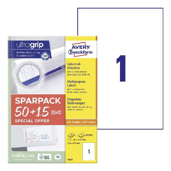 Etikett AVERY 6603 210x297 mm univerzális fehér 65 címke/csomag 50+15 ív/ csomag