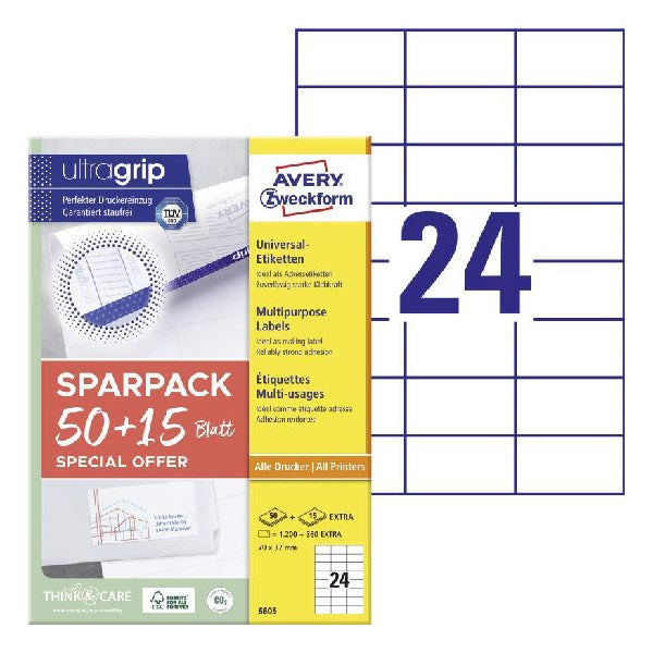 Minőség a címkeszakértőtől: az Avery Zweckform 6605 cikkszámú gazdaságos csomagolású, 50+15 lapot tartalmazó, 70 x 37 mm-es formátumú fehér univerzális címkék abszolút megbízhatóan, tartósan erős tapadással ragadnak papírra, kartonra, üvegre és számos hagyományos műanyagra. A címkék elsődleges megoldást jelentenek a papírok, dokumentumok és sok más irat feliratozásához az irodában, a távmunkában és a háztartásban egyaránt. Ez a méret különösen ajánlott címzéshez (1.560 címke/csomag).