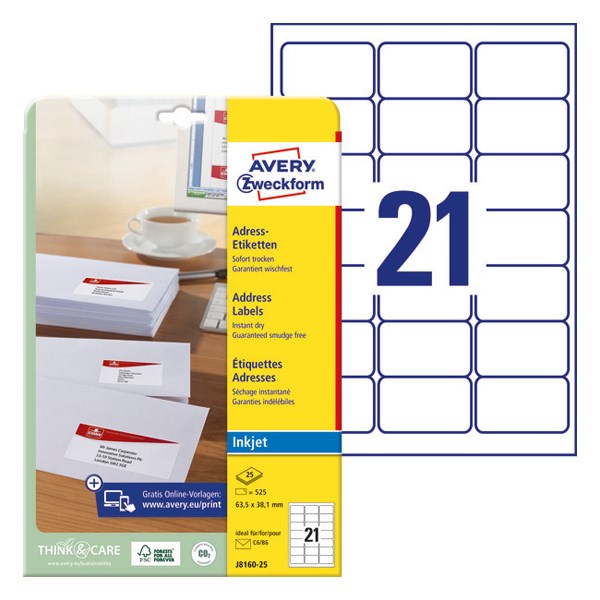 Etikett AVERY J8160-25 63,5x38,1mm inkjet 525 címke/doboz 25 ív/doboz
