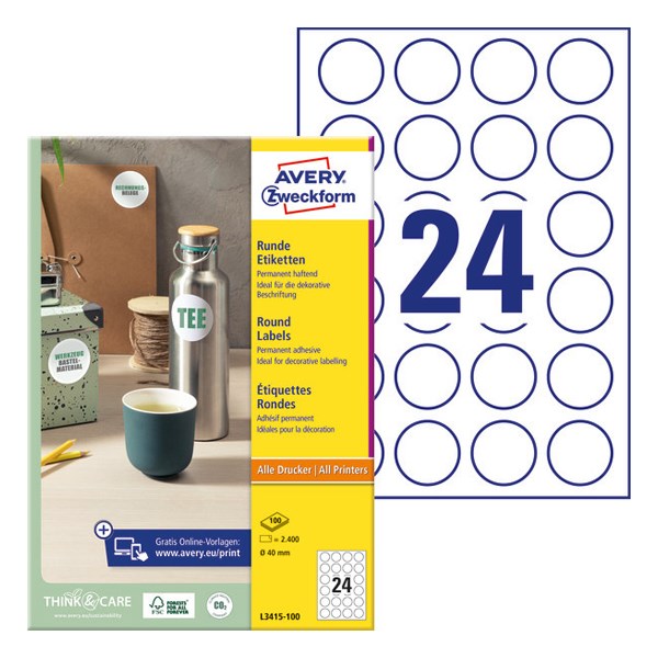Etikett AVERY L3415-100 kör alakú 40 mm átmérő 2400 címke/doboz 100 ív/doboz