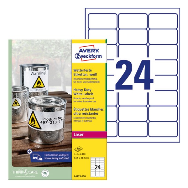 Etikett AVERY L4773-100 63,5x33,9mm időjárásálló fehér poliészter 2400 címke/doboz 100 ív/doboz