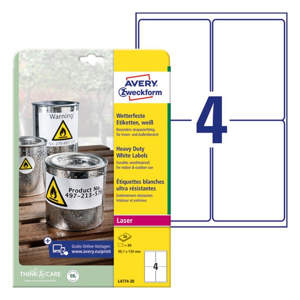 Etikett AVERY L4774-20 99,1x139mm időjárásálló poliészter fehér 80 címke/doboz 20 ív/doboz