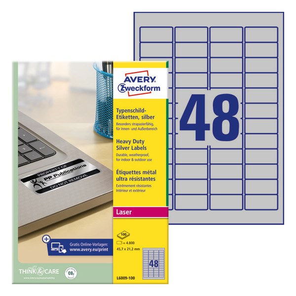Az Avery Zweckform L6009-100 cikkszámú, ezüst, strapabíró időjárásálló címkéi lézernyomtatókhoz 45,7x21,2 mm méretben kifejezetten a tulajdon tárgyaink megbízható és professzionális felcímkézéséhez fejlesztve készültek. 4800 db matt, ezüst, poliészter címke, 100 íven.