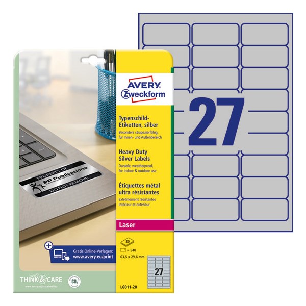 Etikett AVERY L6011-20 63,5x29,6mm lézer ezüst 540 címke/doboz 20 ív/doboz