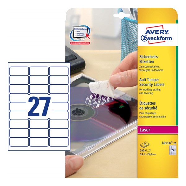 Etikett AVERY L6114-20 63,5x29,6mm laser biztonsági 540 címke/doboz 20 ív/doboz