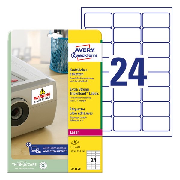 Etikett AVERY L6141-20 63,5x33,9 mm háromször erősebb tapadás 480 címke/doboz 20 ív/doboz