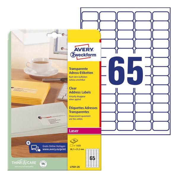Etikett AVERY L7551-25 38x21,2mm laser átlátszó 1625 címke/doboz 25 ív/doboz