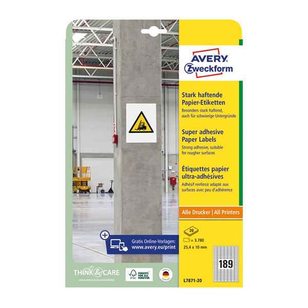 Az L7871-20 cikkszámú, fehér, extra erősen tapadó, 25,4x10 mm méretű AVERY ZWECKFORM papír címke kétszer olyan erősen tapadnak, mint a hagyományos címkék.