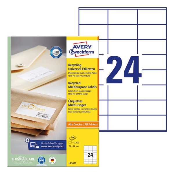 Etikett AVERY LR3475 70x36 mm környezetbarát 2400 címke/doboz 100 ív/doboz