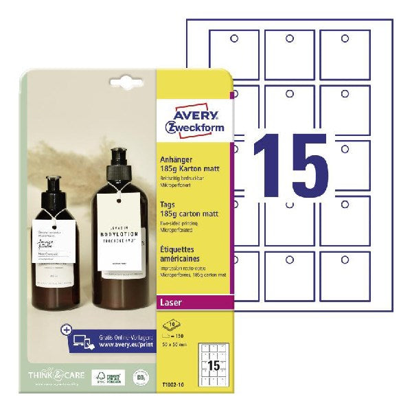 Minőség a címkeszakértőtől: az Avery Zweckform 50 x 50 mm-es négyzet alakú, fehér, mindkét oldalán nyomtatható T1002-10 címkéi nagyon sokoldalúan felhasználhatók. Ideálisak pl. termékcímkeként a kisvállalkozások és független kiskereskedők termékeinek címkézéséhez, függőcímkeként ár- és termékcímkézéshez vagy ajándékcímkeként ajándékcsomagoláskor a kiskereskedelmi ágazatban, textilcímkeként ruházati cikkek címkézéséhez a divatágazatban és magánhasználatra. 150 matt fehér kartoncímke 10 lapon, rögzítőzsinórral.