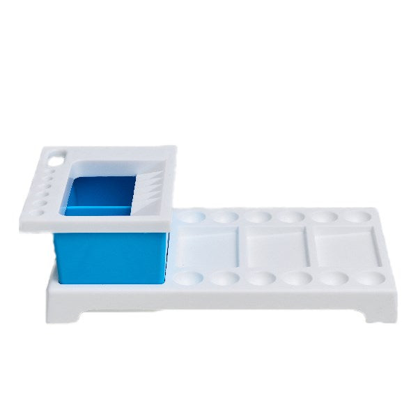 A termék 3 darabból áll: festék keverő paletta, kétrészes víztároló/ecsetmosó tál, ecsettartó perem és lehúzó. Praktikus, kompakt eszköz az otthoni, vagy iskolai festéshez. Strapabíró, könnyen tisztítható anyagból készült, nem deformálódik, stabilan áll az asztalon.