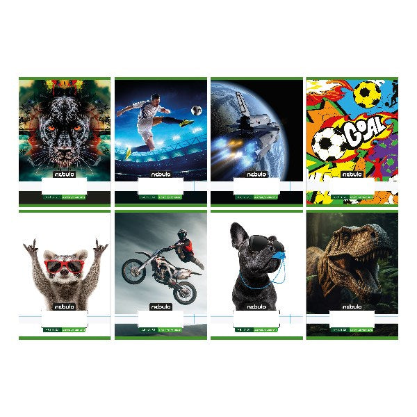 A/5-ös tűzött iskolai füzet 4. osztályos vonalazással, 32 lapos (21-32). 16 db füzet (8 különböző vagány minta, azaz 2db/minta) van egy csomagban. 70 g-os füzetlapok és 200 g-os műnyomó borító fényes fóliával.