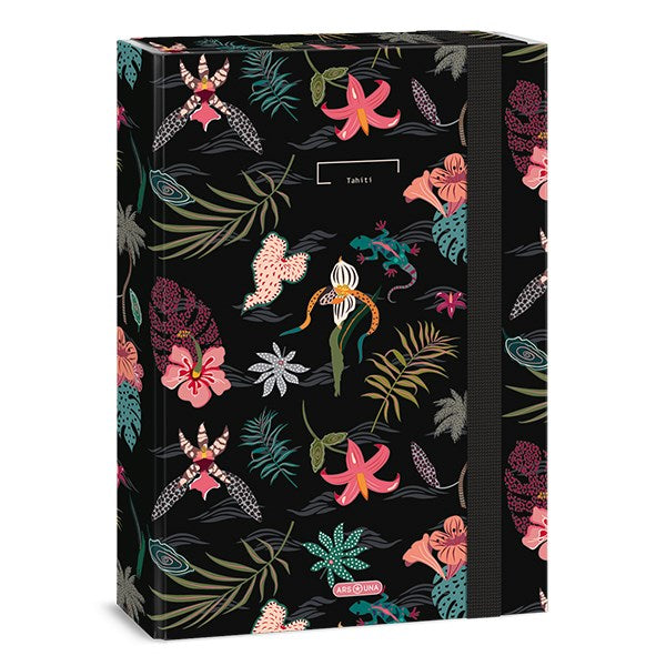 A/4 méretű füzetbox. Kemény, tartós kartonból, 4 cm-es gerinccel, fényes fóliával, 7 mm széles gumipánttal. Belseje egy színnel nyomott. Füzetek, iratok tárolására .