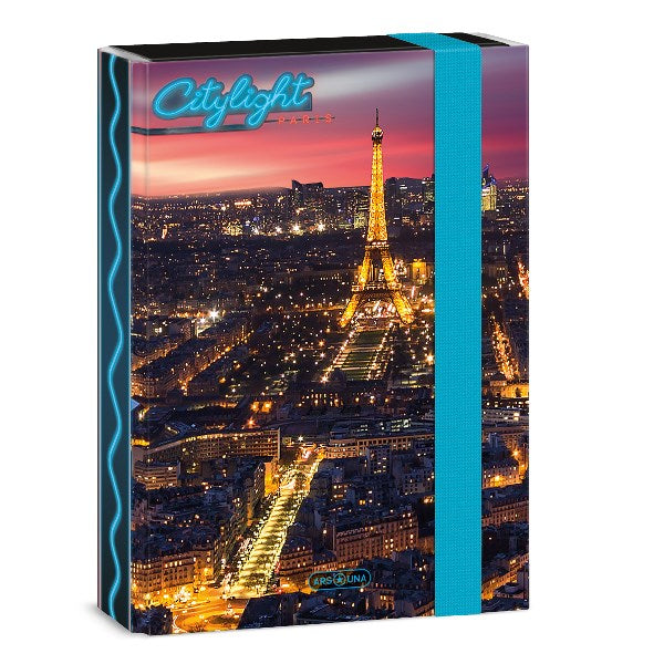 A/5 méretű füzetbox. Kemény, tartós kartonból, 4 cm-es gerinccel, fényes fóliával, 7 mm széles gumipánttal. Belseje egy színnel nyomott. Füzetek, iratok tárolására .