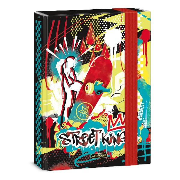 A/5 méretű füzetbox. Kemény, tartós kartonból, 4 cm-es gerinccel, fényes fóliával, 7 mm széles gumipánttal. Belseje egy színnel nyomott. Füzetek, iratok tárolására .