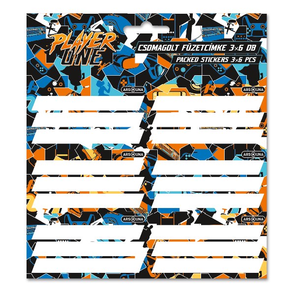 Öntapadós papír füzetcímke, egy csomagban különböző mintákkal. 3 ív x 6 db, összesen 18 db található. Felakasztható fejléccel.