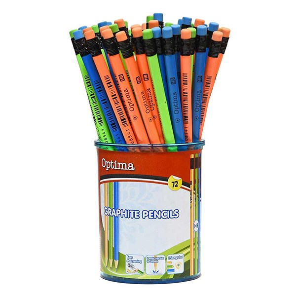 Háromszög grafit ceruza élénk narancssárga, kék és zöld színben, 72 db-os műanyag kínáló hengerben. Keménység: HB