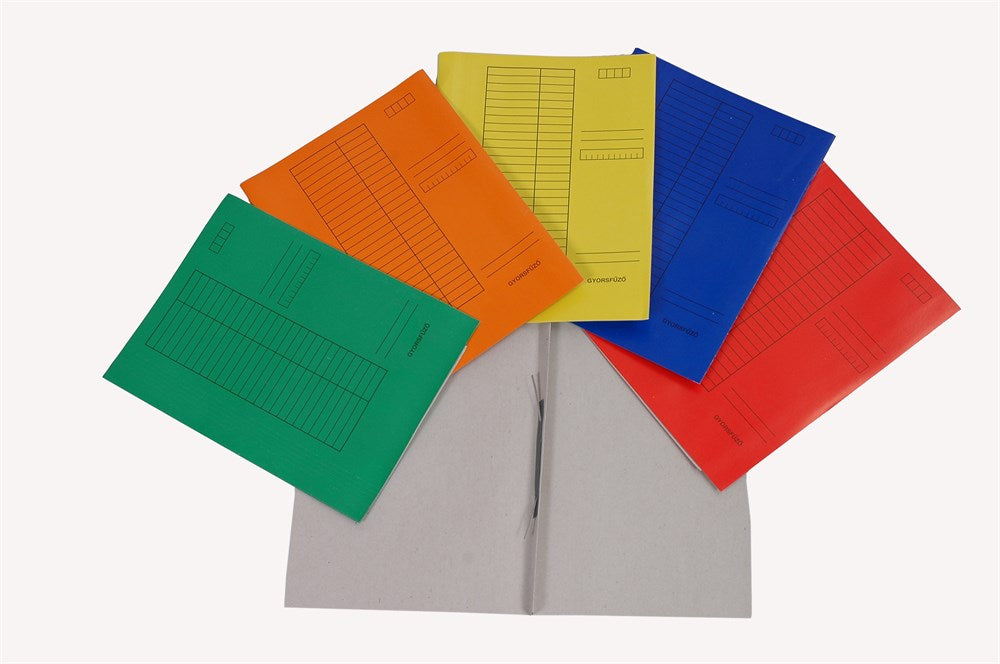 Belül natúr, kívül egyszínű, színes, 230 gr-os kartonból készült gyorsfűző mappa, elején feliratozásra alkalmas nyomattal. A mappában elhelyezett lapok lyukasztás után a fémlefűző szerkezettel rögzíthetők. Kisebb mennyiségű irat tárolására alkalmas.