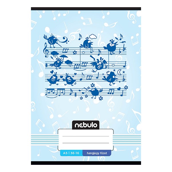 A/5-ös tűzött iskolai hangjegy füzet, 16 lapos (36-16). 16 db füzet (2 különböző minta, azaz 8 db/minta) van egy csomagban. 70 g-os füzetlapok és 200 g-os műnyomó borító fényes fóliával.