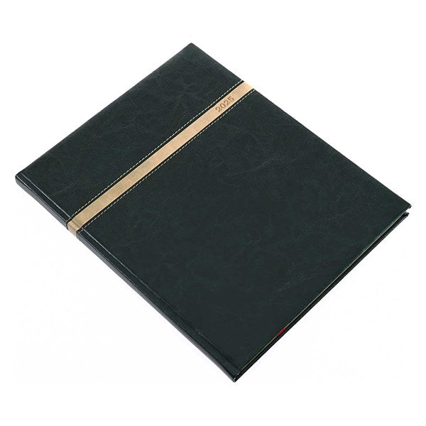Exkluzív varrott műbőr borító. Présfólia és vaknyomással emblémázható. <br> Sárga papíros, cérnafűzött, A/4 heti beosztású, 144 oldalas, sarokperforált, jelzőszalagot és térképet tartalmaz.