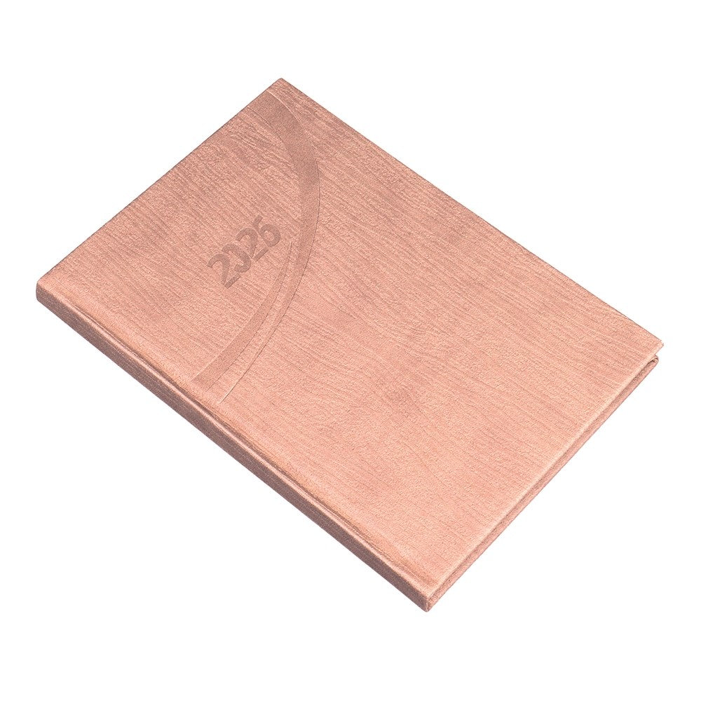 Fashion típusú, merészen struktúrált felületű, magas minőségű műbőr borítás, vaknyomással emblémázható. Fehér papíros, cérnafűzött, A/5 heti beosztású, 144 oldalas, sarokperforált, jelzőszalagot tartalmaz.