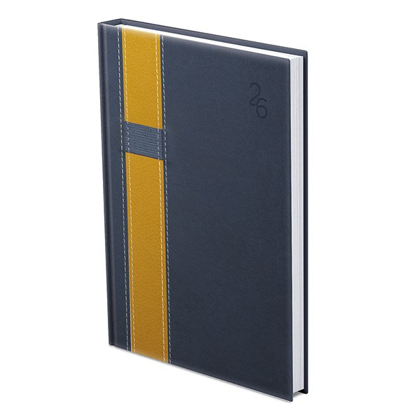Kétféle, matt, bőrhatású és eltérő felületű, hőre színeződő műbőr bevonóval, varrással díszitett, gumis tolltartóval ellátott, fehér tömbös heti naptár, jelzőszalaggal és sarokperforációval. Vaknyomással és lézergravírozással emblémázható.