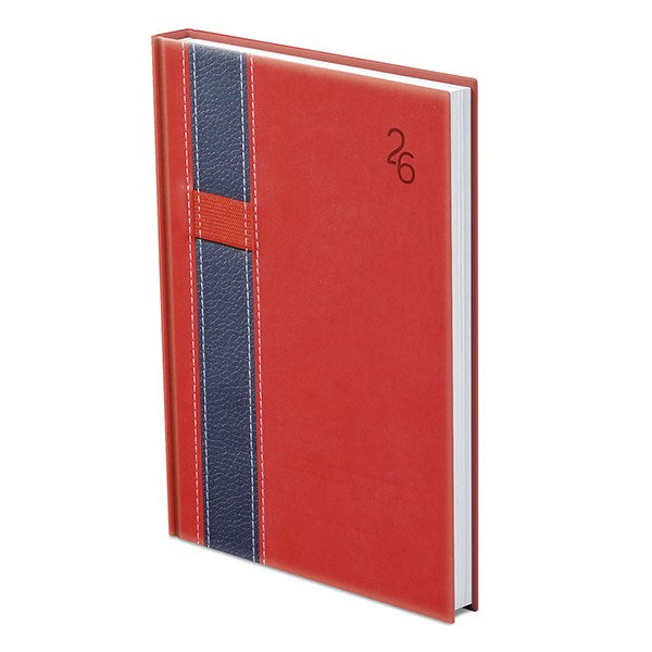 Kétféle, matt, bőrhatású és eltérő felületű, hőre színeződő műbőr bevonóval, varrással díszitett, gumis tolltartóval ellátott, fehér tömbös naptár, jelzőszalaggal és sarokperforációval (kivéve zsebnaptár). Vaknyomással és lézergravírozással emblémázható.