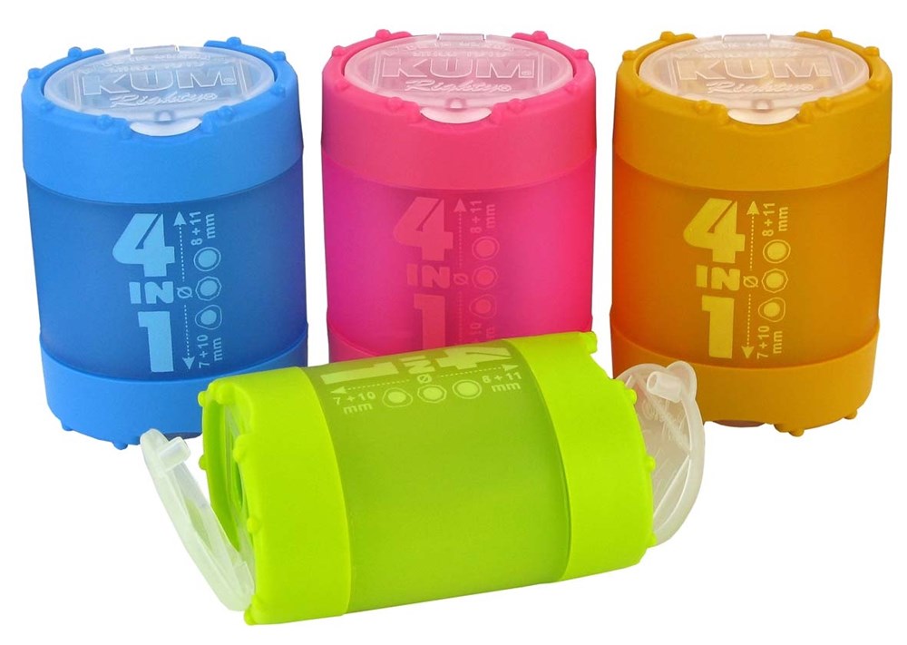 Az első 4 lyukú hegyező a világon! 4 az 1-ben 4 lyukú, tartályos hegyező, 7-11 mm-ig terjedő átmérőjű, hatszögletű, háromszögletű és hengeres testű ceruzák hegyezésére (7mm+10mm és 8mm+11 mm). Méret: 4,5 x 3,5 x 6,1 cm. 4 színben. 20 db/doboz.