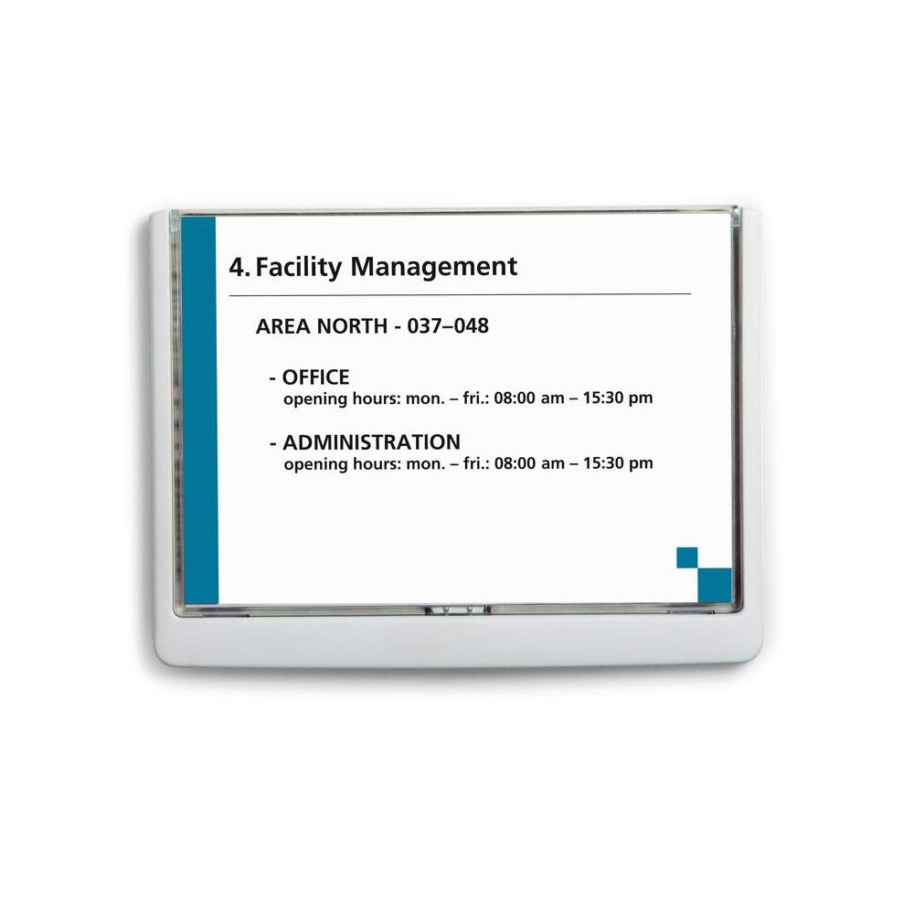 Irányítótábla, stílusosan megtervezett, lekerekített sarkokkal, így a modern design funkcióval párosul. Az insertek könnyedén cserélhetők az átlátszó panel kihúzásával. Ideális megoldás olyan helyeken, ahol az információkat gyakran kell cserélni, mint például hotelekben, konferencia termekben, kórházakban. Nyomtatható insertek külön kaphatók. Katalóguskód: 51745 Hiteles tájékoztatás: Elkötelezettek vagyunk termékeink biztonságának garantálásáért, nyomon követjük a termékbiztonsággal kapcsolatos valamennyi európai uniós és hazai szabályozást és biztosítjuk termékeink azoknak történő megfelelését. Az EU 2023/988-as számú Általános Termékbiztonsági Rendeletét (GPSR) is alkalmazzuk, így ha a termékeink biztonságát illetően fogyasztóként kérdése, észrevétele van, vagy esetleg balesetről van tudomása, kérjük, írja meg nekünk. GPSR: DURABLE Hunke & Jochheim GmbH & Co. KG Westfalenstrasse 77-79, D- 58636 Iserlohn, Germany info@durable.de www.durable.de
