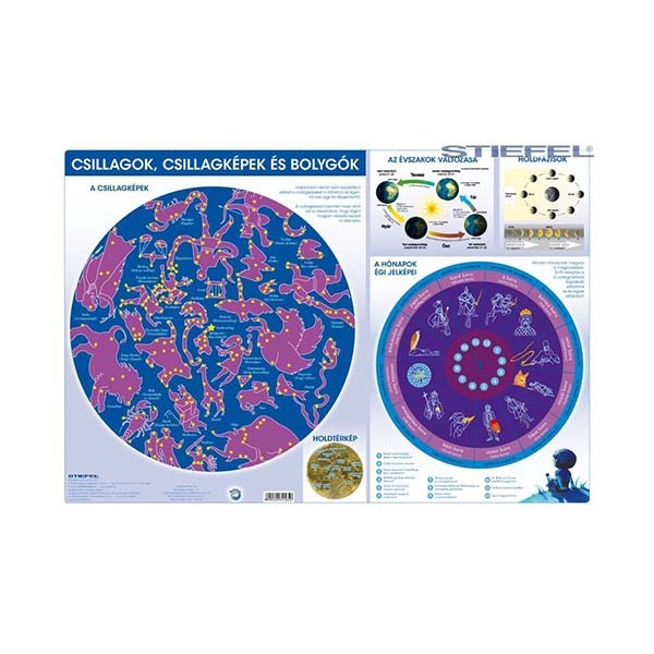 Környezetünk fokozatos megismerése már egészen kicsi kortól foglalkoztat minket. Minél inkább tágul látóterünk, annál inkább használunk térképeket is. A tabló szemléletesen mutatja be a Magyarországról látható csillagképeket, és megismertet a bolygónkkal összefüggő legfontosabb jelenségekkel. A címoldalon a csillagképek grafikus ábrázolásamegkönnyíti azok felismerését. Ezen kívül egy sor hasznos, a Föld forgásával és keringésével összefüggő információt is találhatunk itt: könnyen megérthető a rajzos ábrázolásból,miért változnak az évszakok illetve a Hold fázisai. Egyedülálló módon egy olyan naptár is felkerült a tablóra, amely a hónapok régi magyar nevét tartalmazza. A másik oldalon az északi féltekéről látható égbolt csillagképei mellett a Naprendszer bolygónak fontosabb adatait is megtalálhatjuk. Minden, a csillagászat iránt érdeklődő felnőtt és gyerek számára hasznos, és megkönnyíti az iskolai tananyag elsajátítását is.