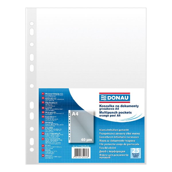Felül nyitott, narancsos felületű, lefűzhető genotherm a dokumentumok gyűrűskönyvekbe és iratrendezőkbe történő iktatásához. 11 lefűzőlyukkal.